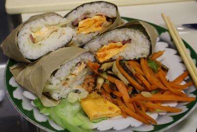 5学年行事では、学校田で育てたお米「きの米」を使い、親子で「おにぎらず」作りをしました。楽しくおいしい活動になりました。