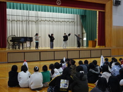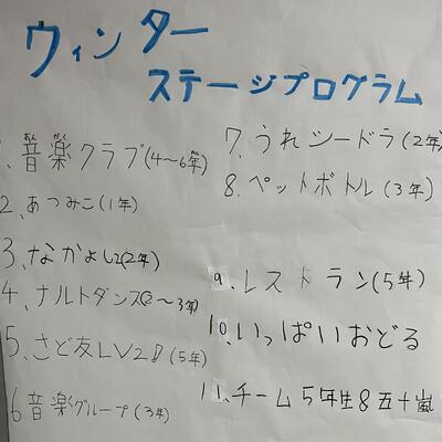 スポーツ委員会の子どもたちが主催する「ウィンターステージ」が行われました。自分の得意なことや好きなことをみんなの前で披露したいという子どもたちが立候補し、ステージに立ちました。それぞれの発表に大きな拍手が送られました。当日欠席等の理由で発表できなかった子どもたちは、発表を撮影した動画を給食等の時間に見てもらうことにしました。