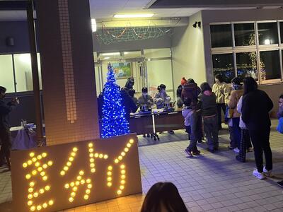 ひだまりこども園、きのと小、乙中の子ども達、保護者の皆様、地域の皆様がたくさん集まり、ルミネーション点灯式が行われました。5年生がふるまいを担当し、6年生が点灯式の運営等を行いました。